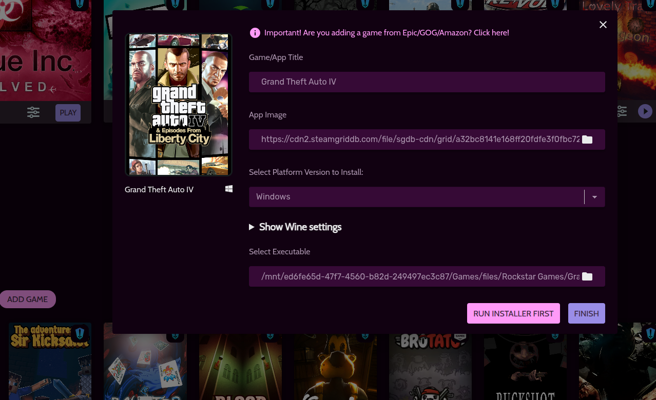 Next, enter the name of your game (the image should be automatically found) and specify the path to the Windows executable.